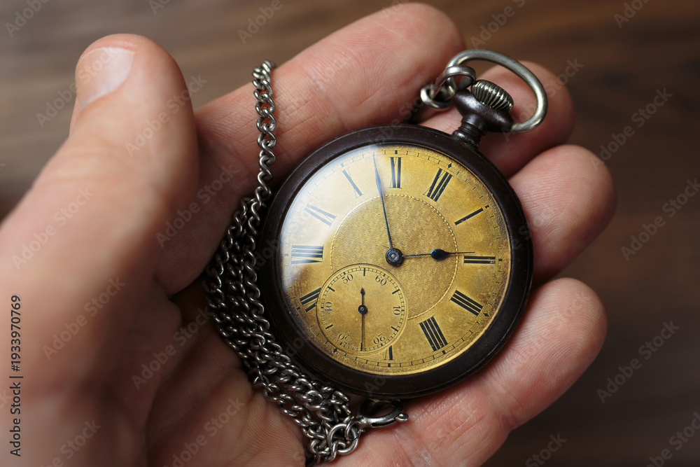 A close-up shot of a person's hand holding an old, golden pocket watch. The watch has a dark case, Roman numerals, and a silver chain. #1933970769