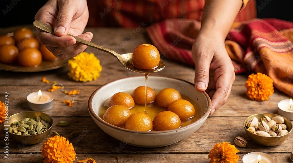 A close-up shot of a person serving Gulab Jamun, a popular Indian sweet, into a bowl filled with syrup. Decorated with marigold flowers and nuts. #1883472797