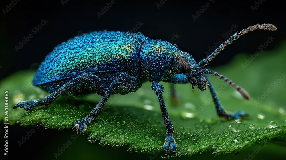 a close-up shot of a radiant, metallic beetle resting on a green leaf. Its textured body is shimmering with iridescent hues, highlighted by glistening water droplets. #1764183885