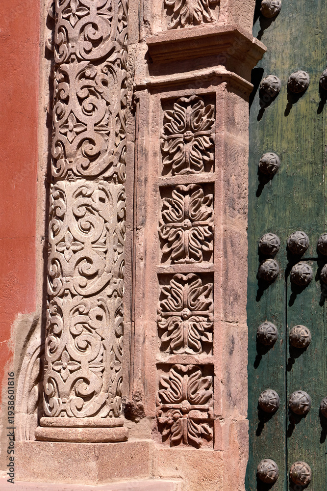 A close-up view captures the elaborate stone carvings on a building entrance in Potosi. The ornate details highlight colonial influence. A studded door appears on the right. #1938601816