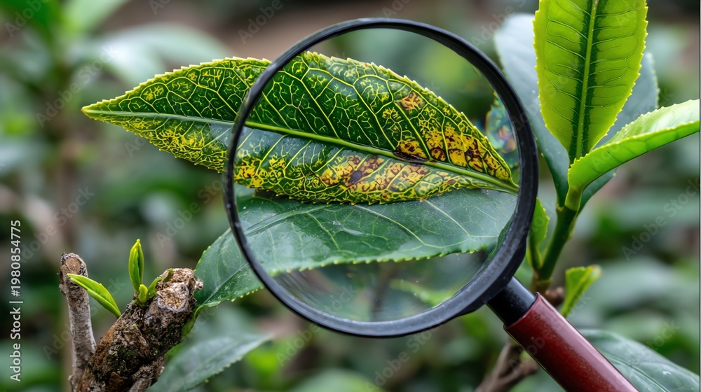 A close-up view of a green tea leaf under a magnifying glass, showcasing its intricate textures and patterns. This image highlights the beauty of nature and its finer details. #1980854775
