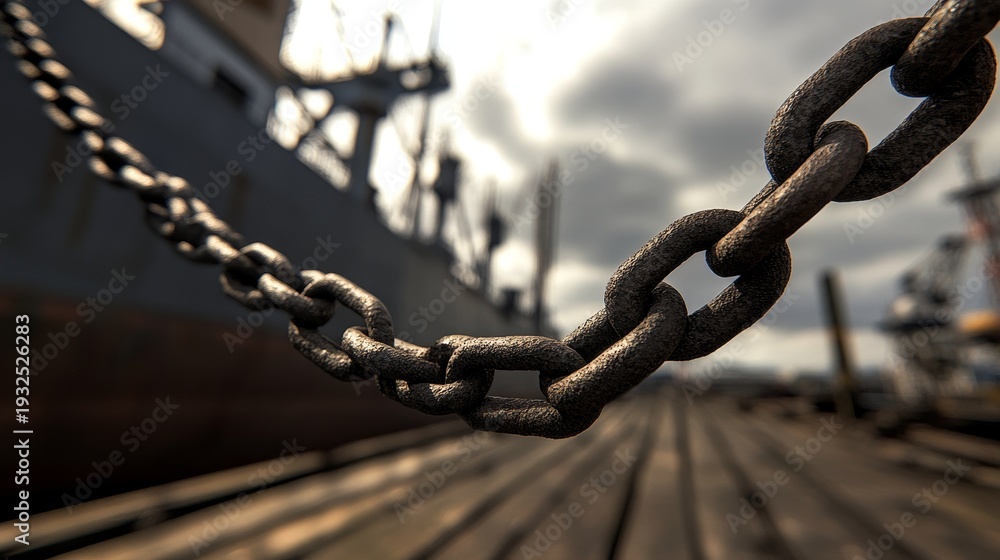 A close-up view of a rusty chain leading to a ship, set against a moody sky and wooden dock #1932526283