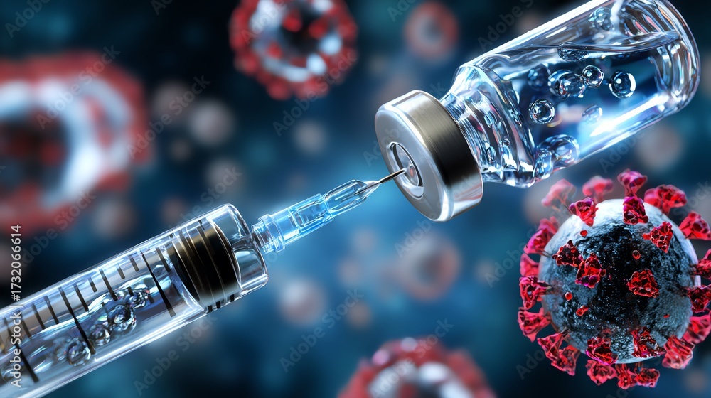 A close-up view of a syringe extracting a vaccine from a vial, surrounded by representations of viruses #1732066614