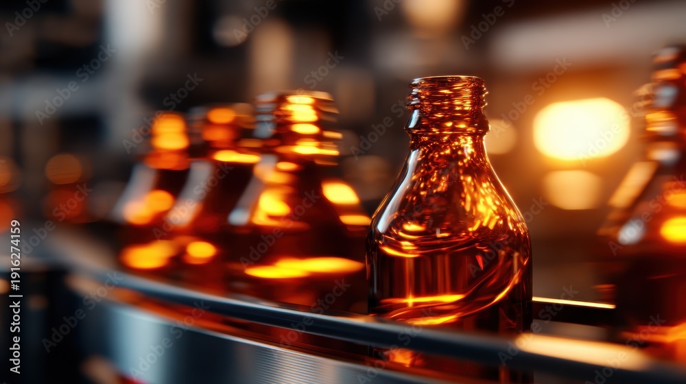 A close-up view of glass bottles glistening under warm light on a conveyor belt, emphasizing industrial processes and the beauty of production lines in business. #1916274159