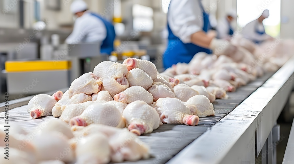 A close up view of perfectly arranged frozen chicken pieces meticulously organized on an industrial conveyor belt showcasing the efficiency and precision of food processing and production technology #1419035348