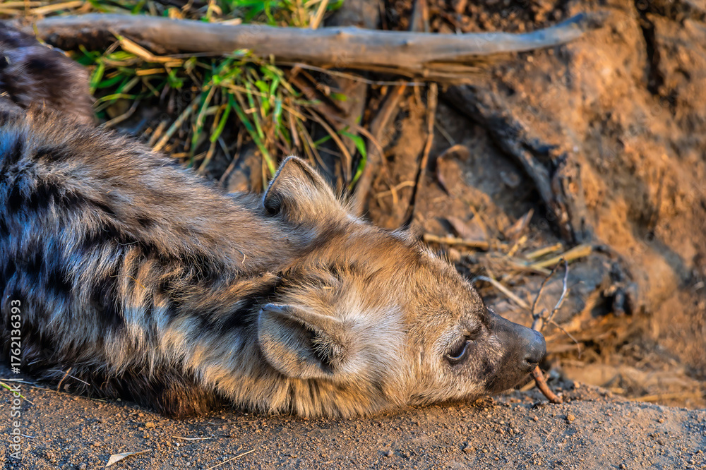 A close up view of the head and neck of a spotted hyena in Kruger national park, South Africa in Springtime #1762136393