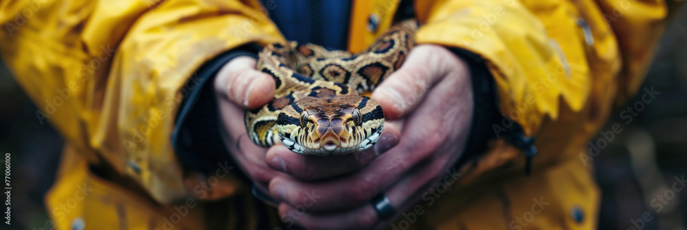 A close view of a person in a yellow jacket gently cradling a python in their hands #770060100