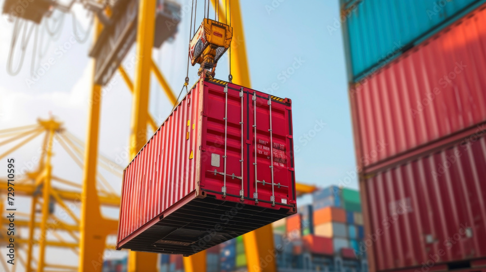 A closeup of a shipping container being lifted by a crane ready to be loaded onto a cargo ship signifying the crucial role of ports in connecting the different modes of transportation #729710595