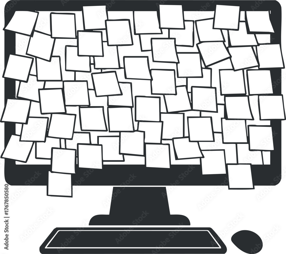 A cluttered computer desktop filled with sticky notes representing disorganization and busy work life. #1767850580