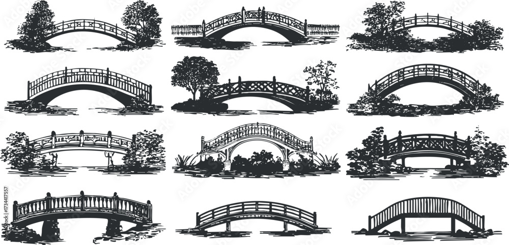 A collection of artistic black and white illustrations of various bridge designs and landscapes.. #1734417557