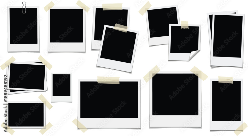 A collection of blank Polaroid photos taped to a white background #1889488192