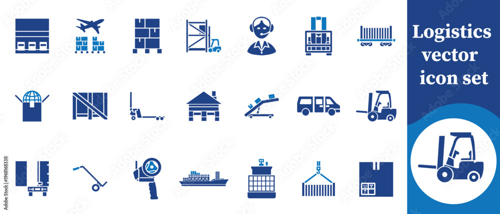 A collection of blue logistics vector icons depicting various elements of supply chain management and transportation high quality professional detailed modern #1968168338