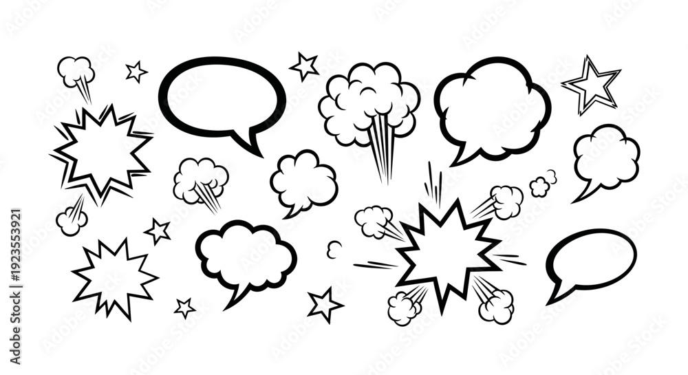 A collection of comic book style speech bubbles and explosion elements with stars and smoke. #1923553921