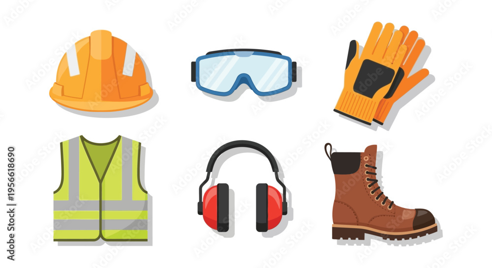 A collection of construction safety equipment including a hard hat goggles gloves and boots silhouette high quality professional detailed modern elegant #1956618690