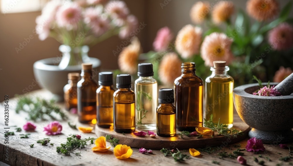 A collection of essential oil bottles with flowers and herbs, aromatherapy, natural remedies, and wellness concept. #1623315452