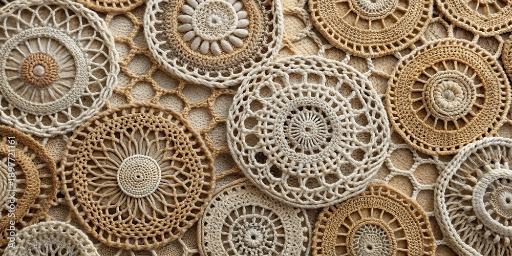 A Collection of Intricately Crafted Circular Crochet Doilies in Earthy Hues, Displaying a Variety of Delicate Patterns and Textures #1897721161