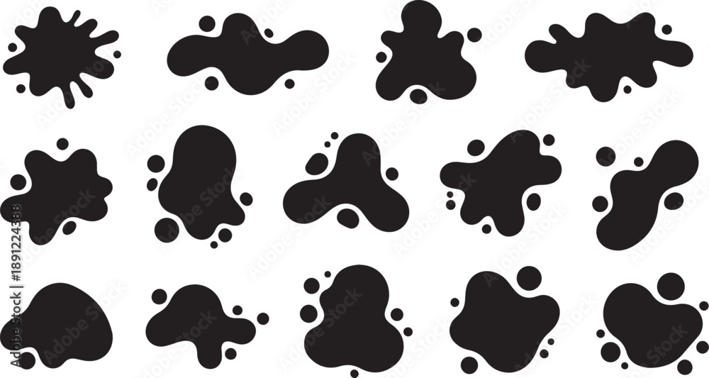 A collection of isolated black abstract blobs and irregular spots. These vector graphic elements are perfect for creating cow print patterns or modern designs. #1891224388