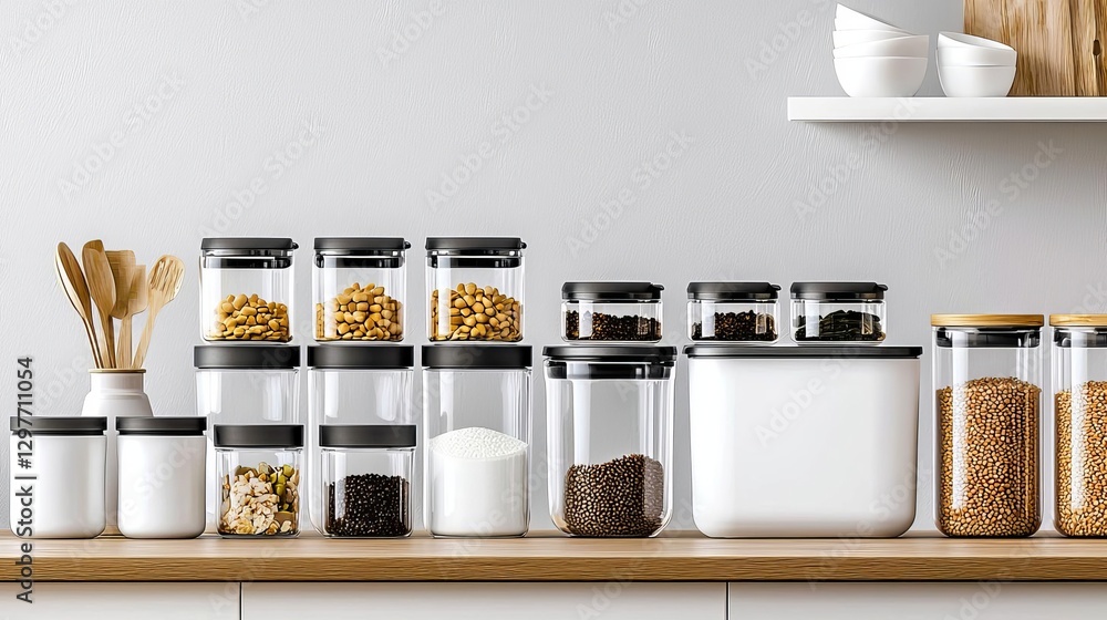 A collection of modern kitchen storage containers on a wooden countertop. #1297711054