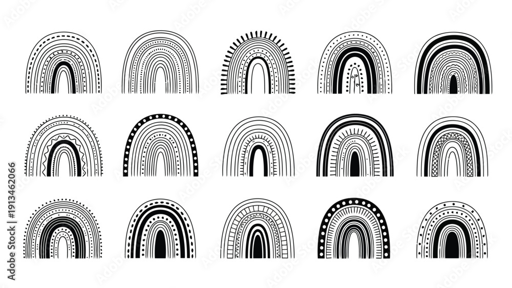 A collection of monochrome arched rainbows with varying striped patterns and differing widths #1913462066