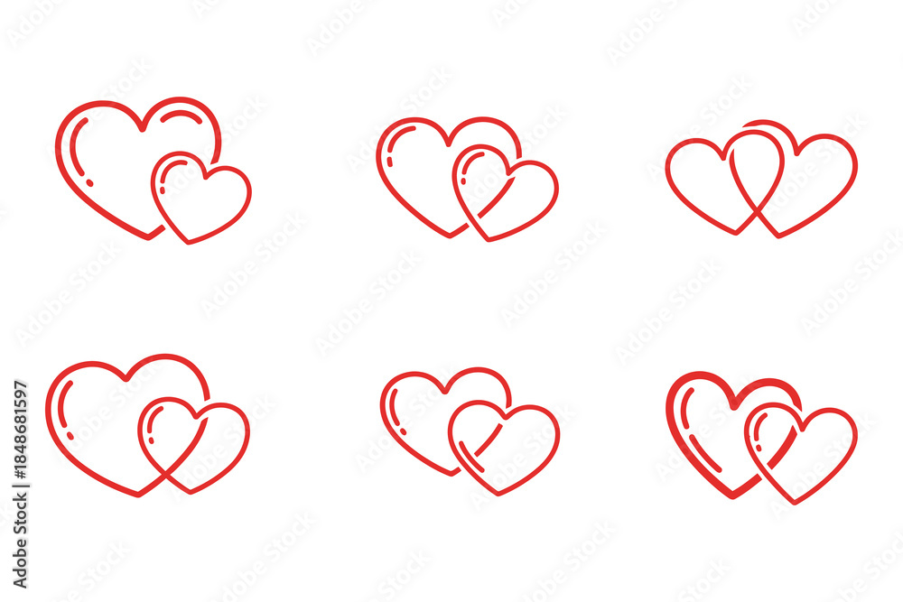 A collection of simple red outline illustrations featuring two overlapping hearts, symbolizing love and connection #1848681597