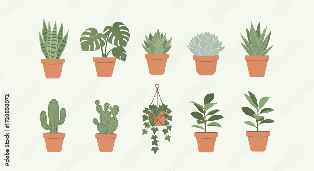 A collection of ten different illustrated houseplants, including succulents and cacti, in simple terracotta pots. #1728858072