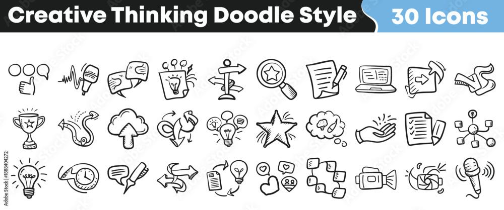 A collection of thirty hand drawn doodle style icons representing creative thinking processes strategy planning and idea generation #1888404272