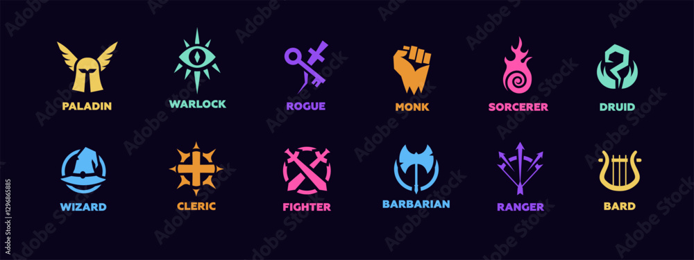 A collection of twelve vibrant fantasy character class symbols each with its own unique design. #1296865885