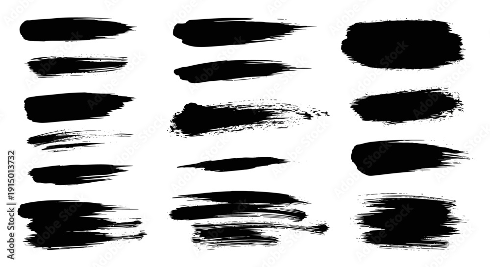 A collection of various black ink brush strokes and paint smears on a white background, showcasing different textures and styles. #1915013732