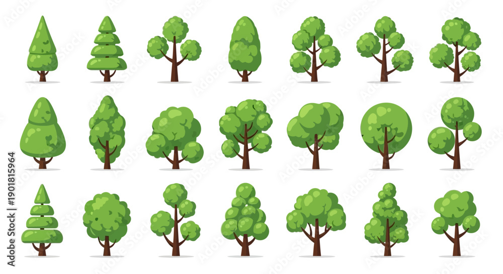 A collection of various cartoon-style green trees with different shapes and sizes, presented on a white background. #1901815964