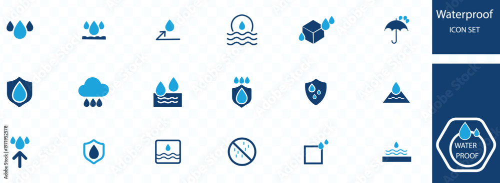 A collection of waterproof icons depicts various water droplet symbols rain shields and weather protection concepts in blue high quality professional detailed modern #1971952578