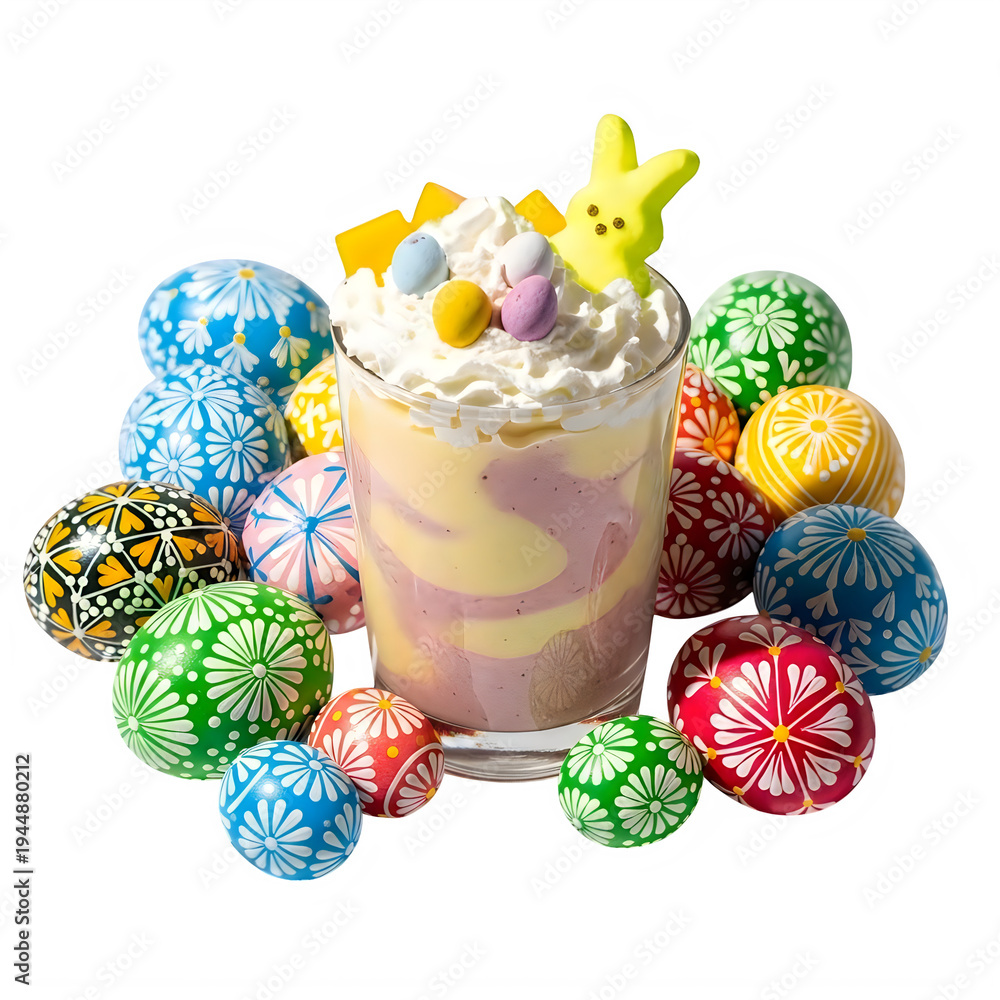 A colorful assortment of easter eggs and a basket filled with pastel-colored eggs. isolated on transparent background #1944880212
