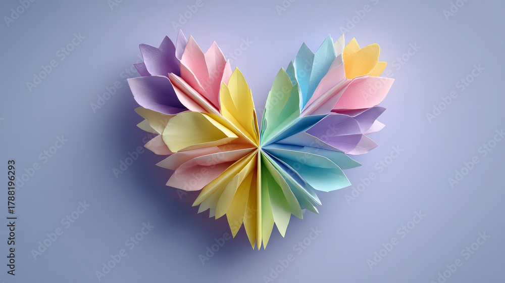 A colorful, heart-shaped origami made of intricately folded paper in multiple pastel hues, displayed on a soft grey background. #1788196293
