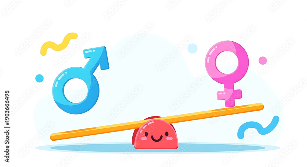 A colorful illustration of a seesaw with a smiling red object and gender symbols on a with decorative elements gender equality #1903666495