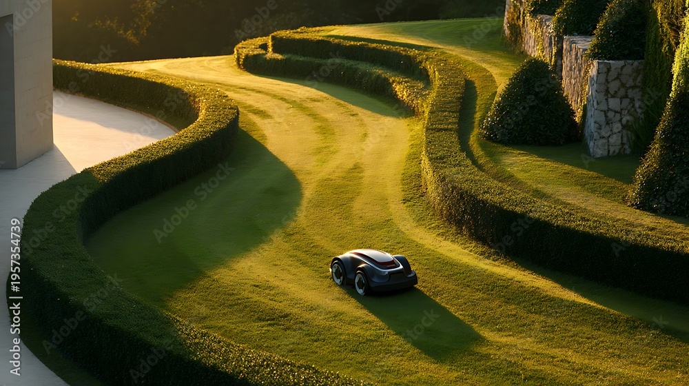 A compact robotic lawn mower navigating through a beautifully landscaped residential lawn as the main subject, within a stylish home garden featuring curved pathways, sculpted hedges and minimalist la #1957354739