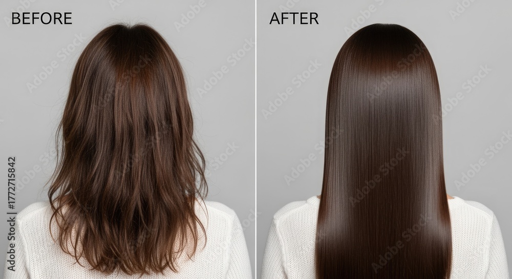 A comparison of hair transformation showing a woman with wavy brown hair on the left and sleek, straight brown hair on the right. Both images are labeled 'Before' and 'After'. #1772715842