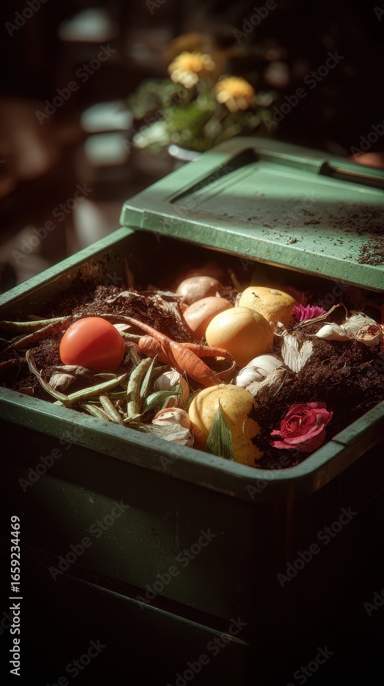 A compost bin holds kitchen scraps like fruit peels, veggies, and flowers for composting #1659234469