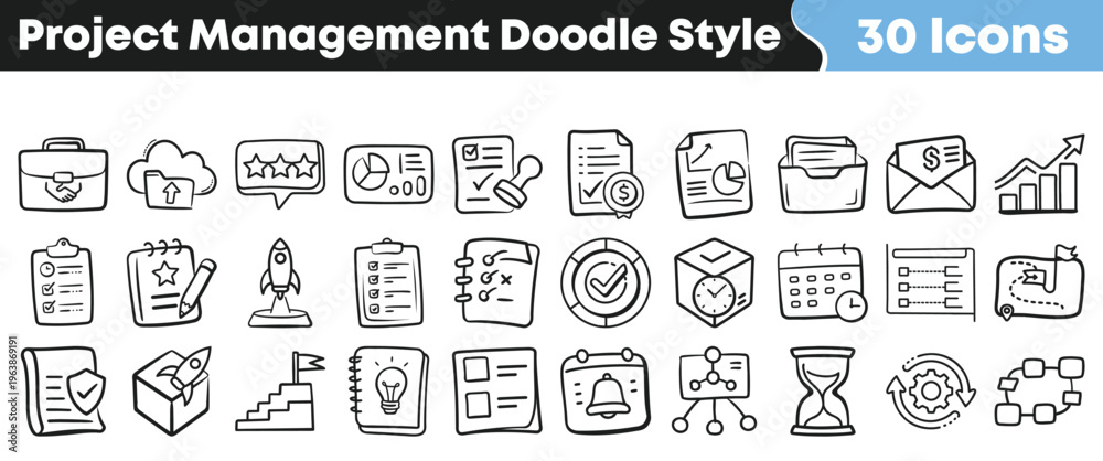 A comprehensive collection of hand-drawn project management doodle style icons depicting various business, planning, and task organization concepts for digital use. #1963869191