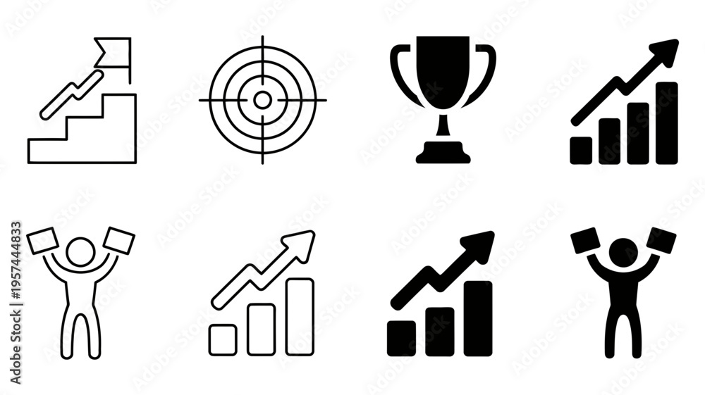 A comprehensive set of eight black icons illustrating various concepts of triumph and progress. #1957444833