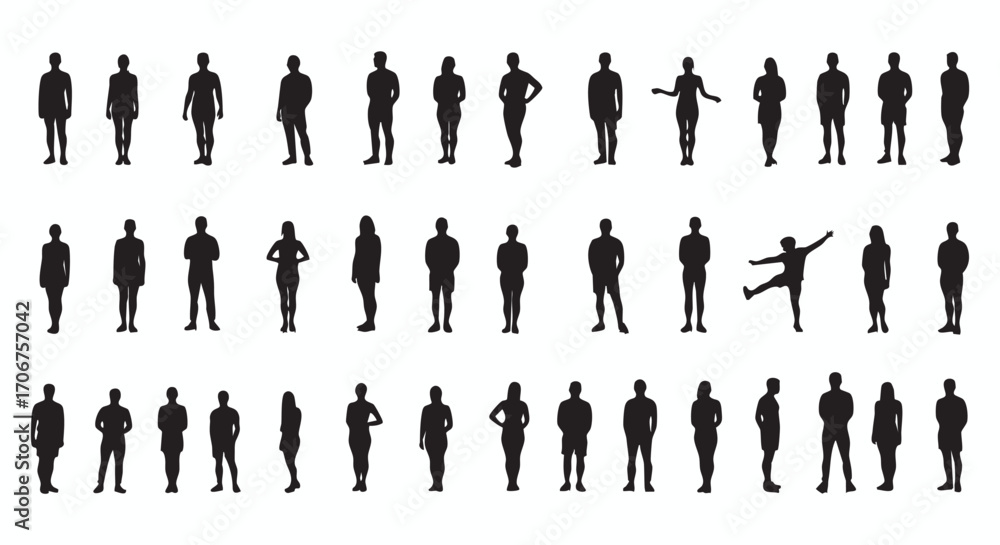 A comprehensive silhouette vector illustration set of diverse people standing in various casual and active poses, perfect for design. #1706757042