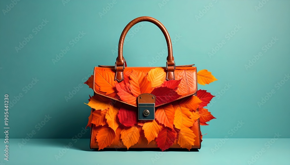 A conceptual autumn handbag adorned with vibrant leaves, showcasing a touch of surreal silliness against a minimalist turquoise background in a studio setting. #1905441230