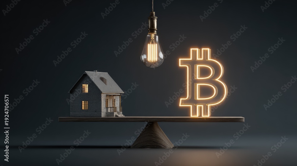A conceptual image showcasing the balance between real estate and cryptocurrency, featuring a small house model alongside a glowing Bitcoin symbol, representing financial investment decisions. #1924706571