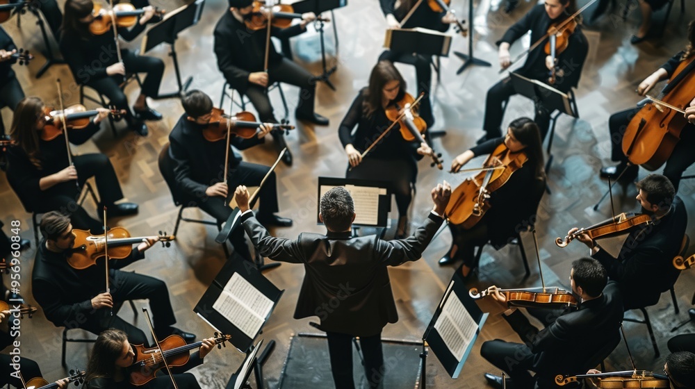 A conductor ardently directs an orchestra from a high-angle perspective, capturing the unity and brilliance of the musicians. #956960848