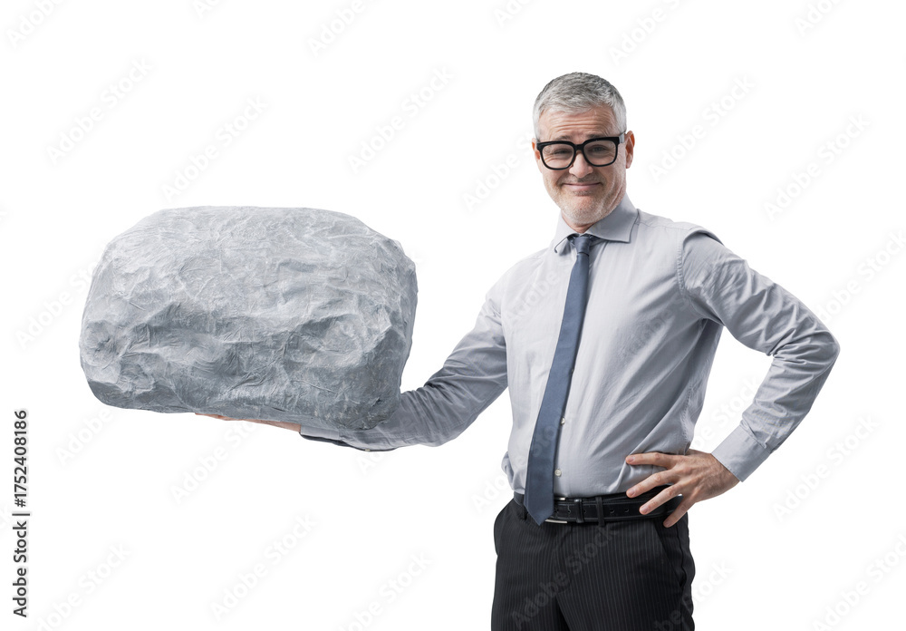 A Confident Businessman Lifting a Heavy Boulder with One Hand and Smiling at the Camera #1752408186