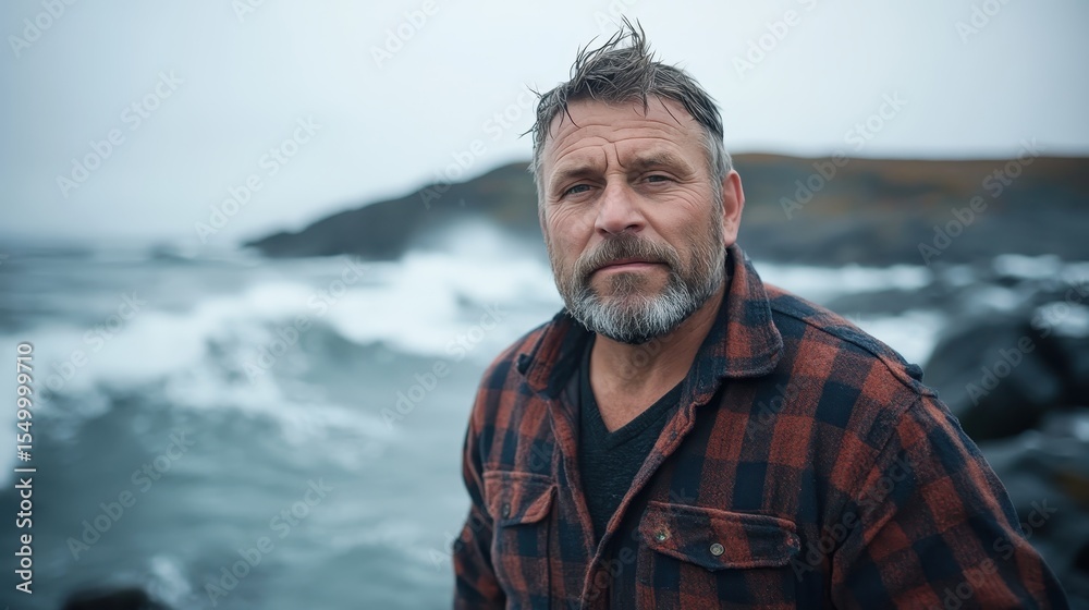 A contemplative man standing near a rugged coastline, looking out over the ocean, reflecting on life amidst the dramatic and inspiring backdrop of nature's beauty. #1549999710