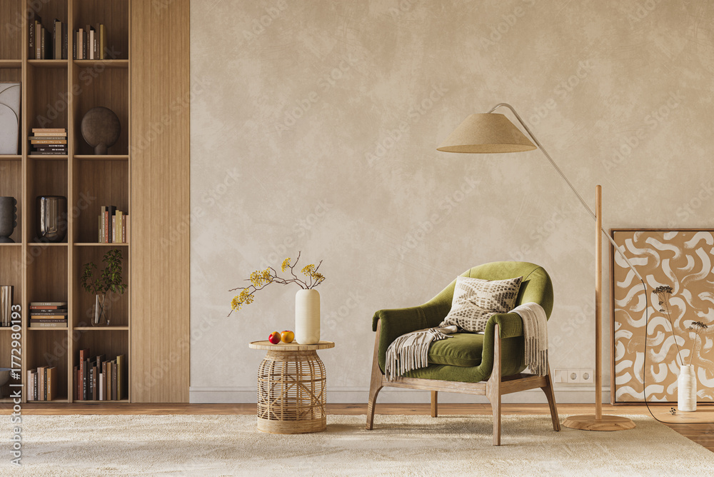 A contemporary living room interior design mock-up featuring vibrant decorative accents, 3D render #1772980193