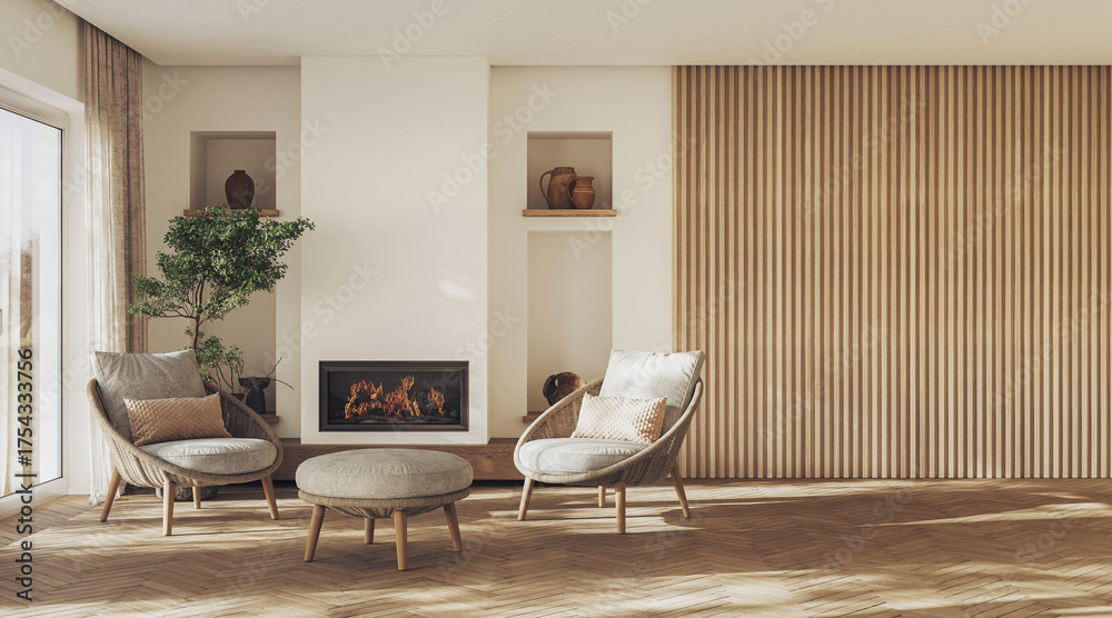 A contemporary living room interior design with fireplace and wall paneling featuring vibrant decorative accents, 3D render #1754333756