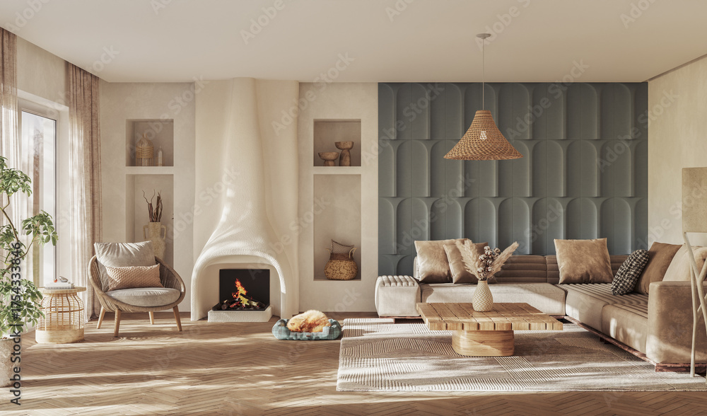 A contemporary living room interior design with fireplace and wall paneling featuring vibrant decorative accents, 3D render #1754333846