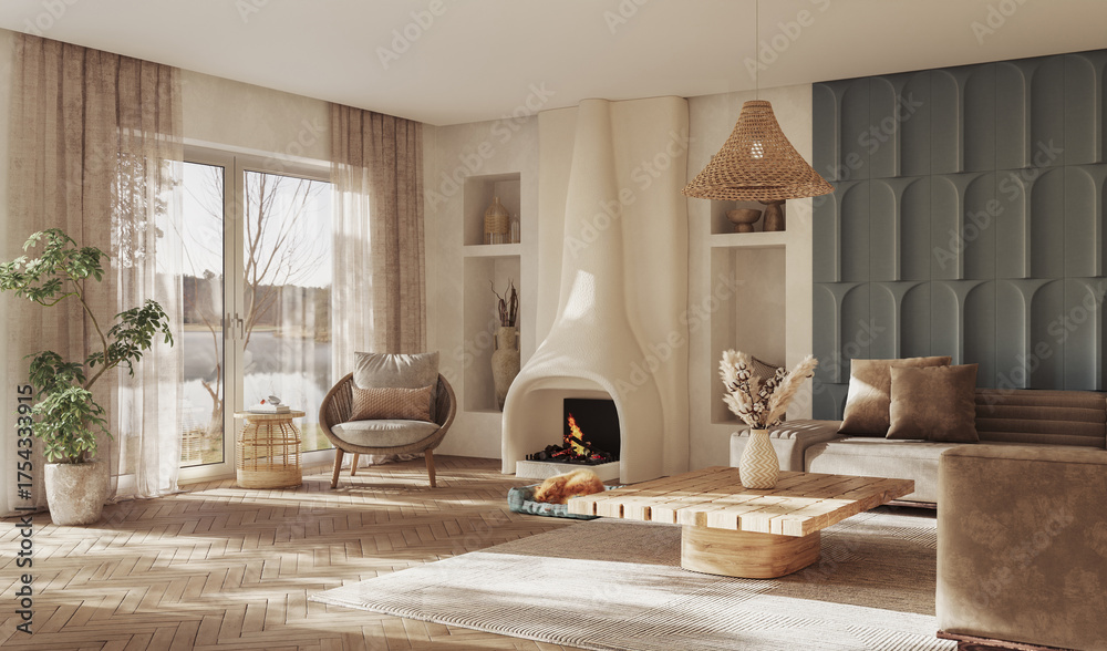 A contemporary living room interior design with fireplace and wall paneling featuring vibrant decorative accents, 3D render #1754333915