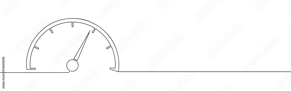 A continuous line art depiction of a speedometer or gauge with its needle indicating a specific value, isolated on a white background #1786428288