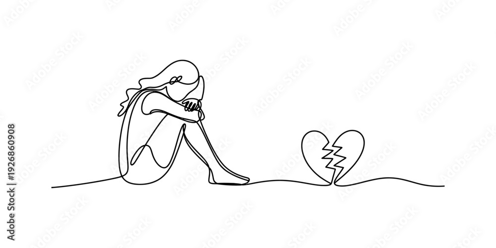 A continuous line drawing illustrating a sad woman sitting next to a broken heart symbol, representing heartbreak and grief. Vector, illustration #1926860908